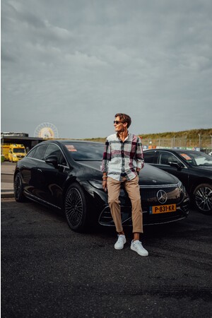 ジョージ・ラッセルは2023年プレフォールコレクションのグローバルストライプチェックシャツとテーパードハンプトンフィットのチノパンツを着用しています。