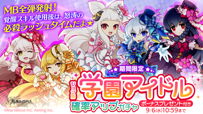 株式会社マーベラス(代表取締役社長:佐藤 澄宣/所在地:東京都品川区)は、スマートフォン向け本格オンラインRPG『剣と魔法のログレス いにしえの女神』において、2023/8/30(水)に「ジョブ別 学園アイドル確率アップガチャ」の販売、および「入門!たけみかづち一座」の開催などを含むアップデートを行ったことをお知らせいたします。