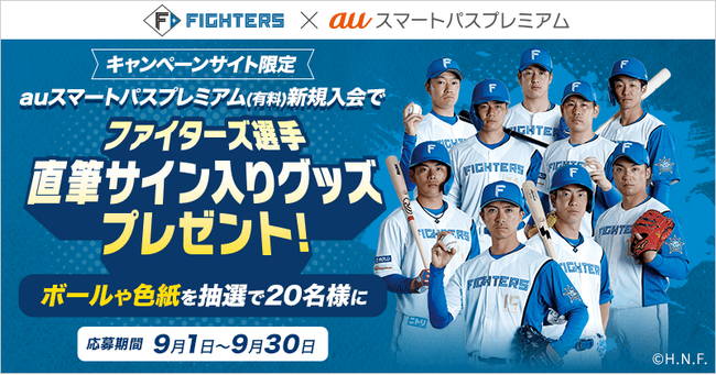 「auスマートパスプレミアム」では、「北海道日本ハムファイターズ × auスマートパスプレミアム」キャンペーンサイトから2023年9月1日から30日までの期間中に「auスマートパスプレミアム」に新規入会した方を対象に、北海道日本ハムファイターズ選手の直筆サイン入りグッズを抽選で合計20名様にプレゼントします。