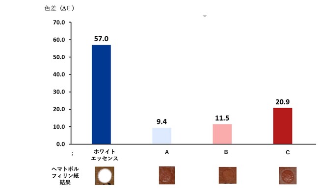 ※4:4種の薬材を、各商品の推奨条件の元、使用したときのホワイトニング効果を比較。ヘマトポルフィリン紙を用いたホワイトニング色差は、3回の実験に基づいた平均値を記載。
