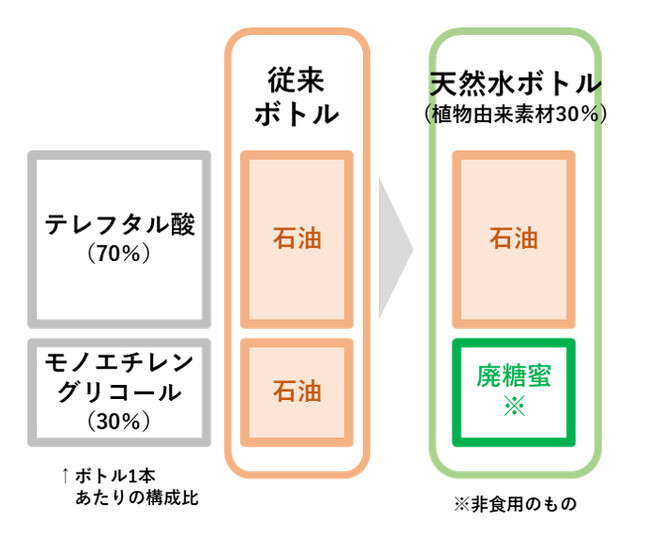 ペットボトルは、「テレフタル酸」が原料の70%、「モノエチレングリコール」が30%で構成されています