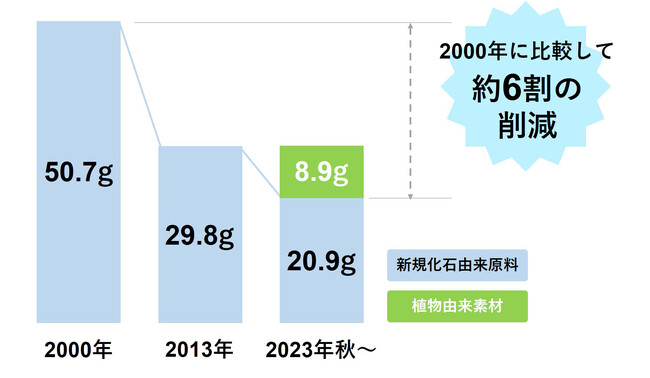 「サントリー天然水」ブランドでは、これまでペットボトルの軽量化を進めており、2Lペットボトルでは、2000年の57.0gから現在では29.8gまで軽量化を実現していますが、さらに今回、ペットボトル重量のうち30%分を植物由来素材に切り替えることにより、ペットボトル1本あたり約9gの新規化石由来原料を削減しました。これらの活動により、1本あたりの新規化石由来原料の使用量は、2000年と比較すると、約6割も削減しています。