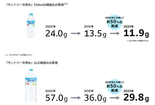 2023年 4月 植物由来原料を30%使用したペットボトルを「サントリー天然水」2Lペットボトルに導入開始、9月製造分から全数導入完了