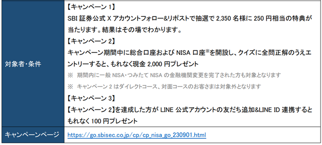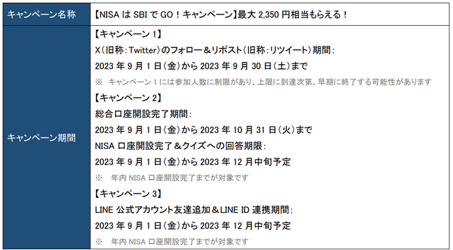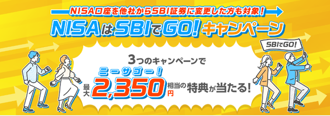 株式会社SBI証券(本社:東京都港区、代表取締役社長:高村正人、以下「当社」)は、新規で証券総合口座を開設されたお客さまに加えて、NISA口座を他社から当社に変更完了されたお客さまを対象として、2023年9月1日(金)から「NISAはSBIでGO!最大2,350(ニーサゴー)円相当もらえる!キャンペーン」を実施しますので、お知らせします。