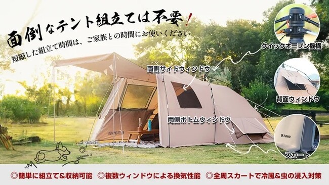 複数窓で通気性抜群!組立て簡単!クイックオープンファミリーテント(T3S)をMakuakeにて先行販売開始!目標額を達成、事前購入で最大38%OFF
