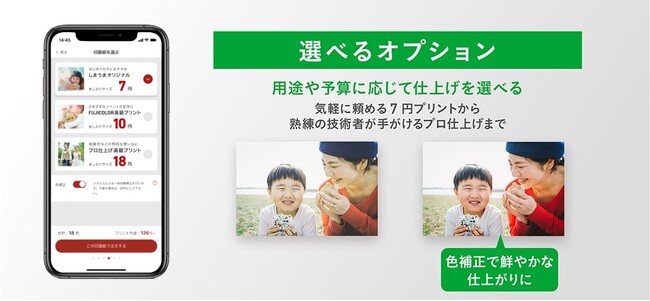 コスパと手軽さが魅力の「しまうまオリジナル」、FUJIFILM社の純正印画紙を使った「FUJICOLOR高級プリント」、熟練の技が光るプレミアム品質の「プロ仕上げ高級プリント」の3種類から、用途に応じて選べます。