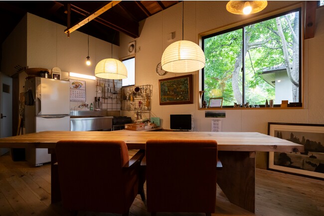 「庭のとまり」という施設内に「かわせみ」と「ふくろう」2棟の宿泊棟があり、それぞれにリビングや寝室、浴室(シャワールーム)など生活設備が充実。周囲は里山の景観、2棟の間には焚き火もできる石庭が広がります。「かわせみ」は吹き抜けLDKが魅力。キッチンや調理器具、食器も揃うので滞在中の食事にも困りません。ともにWi-Fi環境完備で、デスクスペースが設けられています。窓から差し込む緑に癒されながら、木のぬくもりを感じる静かな空間で仕事に没頭できます。