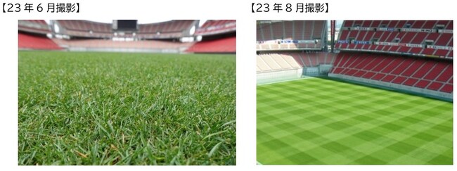 2021年10月からビール酵母細胞壁を活用した農業資材(肥料原料)の、フィールド外周での芝生育の比較試験を開始し、芝の根張りや回復力など、良好な試験結果を受け、23年5月から全面採用となりました。他の資材に加えて、2ー3週間ごとに定期散布し、現在順調に芝が生育しています。芝の根がしっかりと張ることでクッション性が高くなり選手の体への負担が軽減されることなどが期待されます。