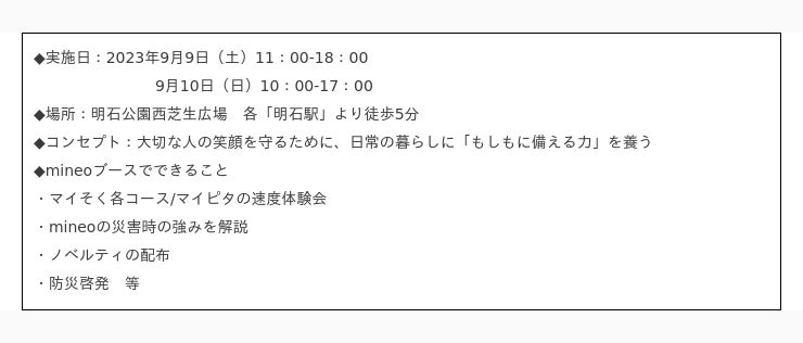 mineoは、罹災地域のご契約者さま、ご利用者さまにパケットを開放する「災害支援タンク」など、災害時にも携帯電話を安心してご利用いただける数々の独自サービスを提供しています。今回、アウトドア・モノづくりを活かした「もしもに備える力」をコンセプトとする本イベントに出展し、災害時の通信の大切さや、罹災時の支援措置をご紹介することで、地域のみなさまの防災意識向上をお手伝いいたします。