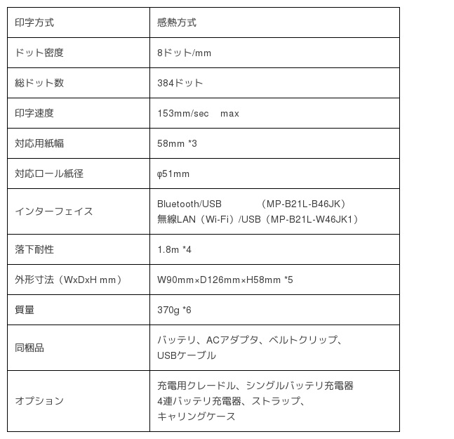 「MP-B21L」は、2021年に販売を開始している3インチラベルモバイルプリンター「MP-B30L」のシリーズモデルです。重さ370gと軽量ながら2インチ紙幅対応のラベルプリンターとしてはクラス最速*1の印字速度(153mm/sec)や落下耐性(1.8m)を実現しています。