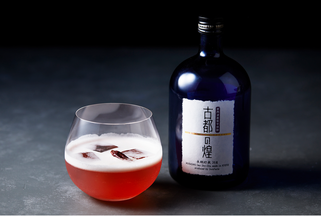 紫芋焼酎「古都の煌」をベースに、グランマニエとサンジェルマン、そして唐辛子や京番茶を漬け込んだクランベリージュース、さらに豆水、ソーダを使用。