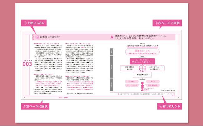 上図のとおり1.上部にQ&A、2.左ページに解説、3.右ページに図解、4.右下にはツボを理解し実践するためのヒントを記載しました。