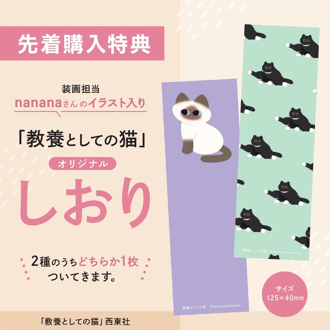 本書の発売を記念して、Amazon・楽天ブックスで購入した方を対象に特典をご用意しました。nananaさんが描くキュートなポーズの猫ちゃんをあしらった特製しおりです。2種のデザインのうち、いずれかがランダムでもらえます。