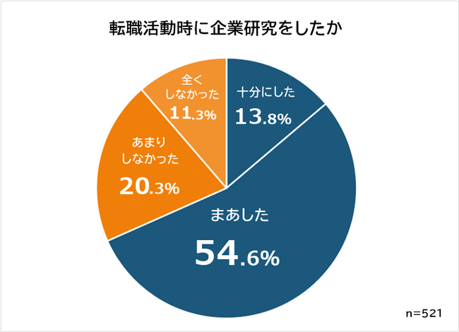 転職経験者521人に「転職活動時に企業研究をしたか」と聞いたところ、「十分にした」と答えた人は13.8%で、1割強にとどまりました。「十分にやりきった」と自信をもっていえる人は少ないとわかります。