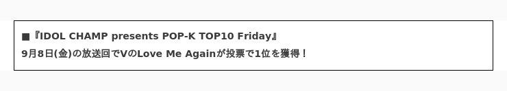 『IDOL CHAMP presents POP-K TOP10 Friday9月8日(金)の放送回において、VのLove Me Againが、チャート投票で1位を獲得し、今週のNo.1曲として番組内で放送されました。