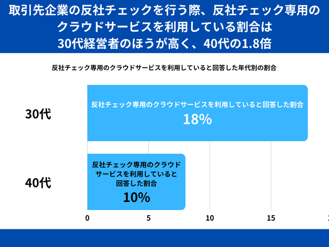【取引先企業の反社チェックを行う際、反社チェック専用のクラウドサービスを利用している割合は30代経営者のほうが高く、40代の1.8倍】