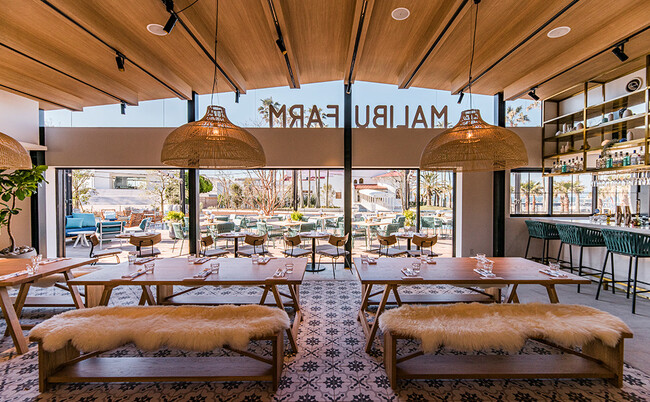 『マリブファーム 逗子マリーナ』では、現地の人気メニューの他、地元湘南の新鮮野菜や相模湾の魚介類を使用した日本限定メニューもご用意しています。全開可能なサッシによりテラス席と内部が一体となる設えで、約50席の屋内席の他、マリーナの海から繋がるような大きな水盤が広がる約80席のテラスには、三方を水に包まれたウォーターテラス席や、暖炉を囲むファイヤーテラス席などシチュエーションに応じてお使いいただけます。豊富なテラス席を有するため、ペット同伴でのお食事に最適なレストランです。