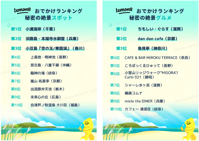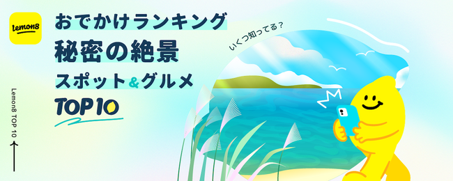 ライフスタイル共有アプリ「 Lemon8(レモンエイト)」は、Lemon8内で過去1年間に投稿された約40万件の投稿のうち、位置情報をつけた投稿の分析結果を元に、都心から日帰りできる穴場絶景や日本最大級のサンゴ礁の海などに人気が高まった「秘密の絶景スポット」、自然を感じるテラス席や日本遺産が臨める絶景カフェなどに人気が集まった「秘密の絶景グルメ」という2つのテーマを選出し、各ランキングTOP10を発表します。