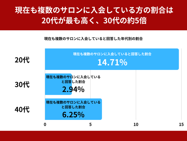現在も複数のサロンに入会していると回答した割合を年代別でみてみますと、20代が最も高く14.71%、次いで40代が6.26%、30代は2.94%という結果になりました。