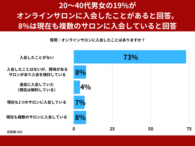20~40代男女を対象とした「オンラインサロンに入会したことはありますか?」というアンケートで最も多かった回答は「入会したことがない」で73%でした。