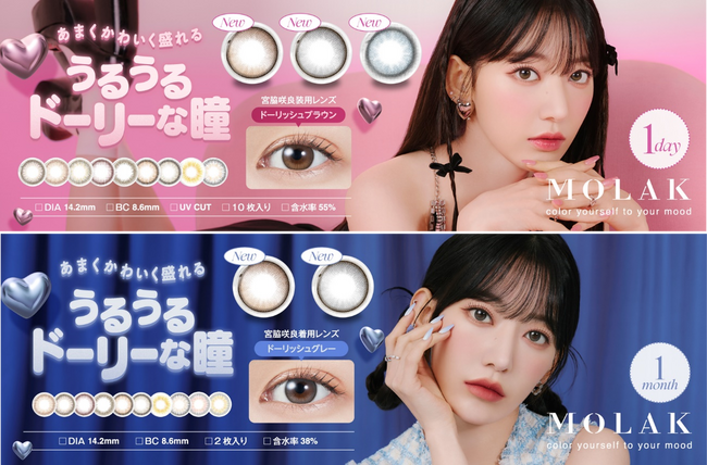 『MOLAK』待望の新色は「あまくかわいく盛れる(ハート)”うるうるドーリーな瞳”」をコンセプトに、写真でもリアルでも盛れる”ちゅるん透明感カラー”が特徴。トレンドの水光デザインを取り入れた「Dollish Brown(ドーリッシュブラウン)」「Dollish Gray(ドーリッシュグレー)」、1DAY限定の「Bubble Blue(バブルブルー)」の3色展開です。