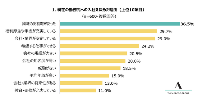 勤務先への入社を決めた理由としてもっとも多かったのは「興味のある業界だった」(36.5%)