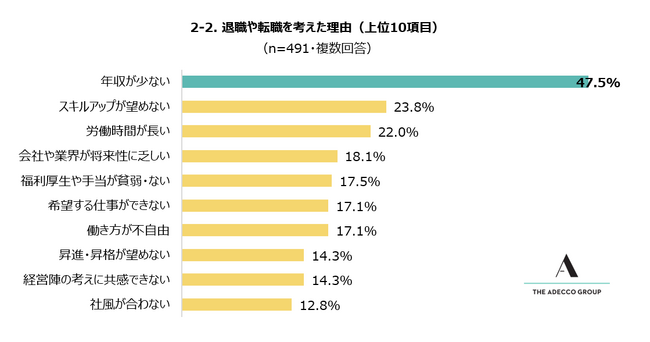 続けて、「退職や転職を考えたことがある」と回答した491人に対し、「退職や転職を考えた理由は何ですか?」と質問したところ、もっとも多かった回答は「年収が少ない」(47.5%)でした。