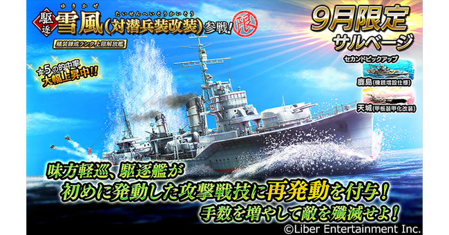 株式会社リベル・エンタテインメントは、男性向けオリジナルタイトル『蒼焔の艦隊』(そうえんのかんたい、iOS/Android/DMM Games)について、9月10日(日)より、新たに雪風(対潜兵装改装)が参戦する限定サルベージが開催されていることをお知らせいたします。