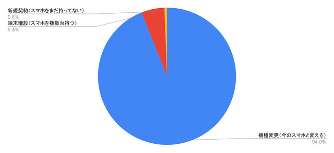 「もしiPhone 15を購入するならどの形態で購入しますか?」という質問に対して、94%の方が「機種変更(今のスマホと変える)」と答えています。