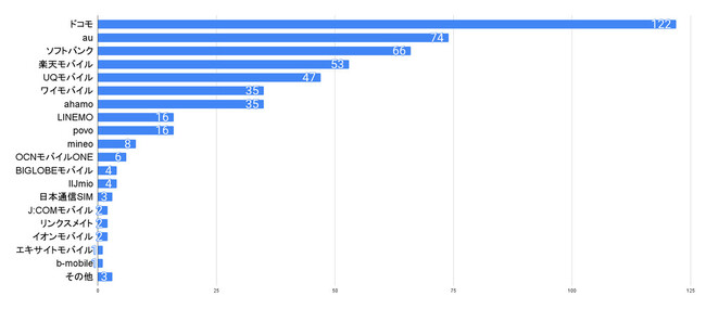 「現在契約しているキャリアを教えてください」という質問に対して、ドコモやau、ソフトバンク、楽天モバイルといった新型iPhoneを発売しているキャリアが多い結果となりました。