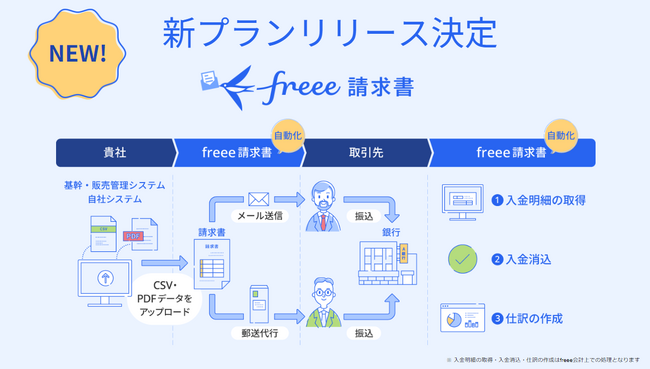 freee請求書新プランは、請求書のデータ(PDF・CSV)をfreee請求書に取り込むだけで、今の請求書のフォーマットを変更せず取引先に応じてメールや郵送代行で送付することが可能です。また、その後の入金消込や仕訳までfreee請求書上で自動で行います。