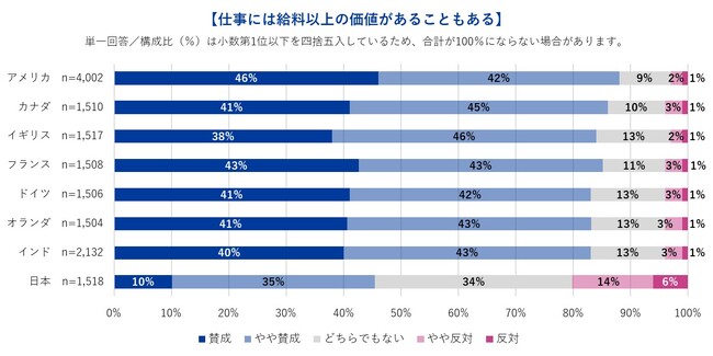 「仕事には給料以上の価値があることもある」という考えに賛成する人の割合を見ると、他7ヵ国に比べ日本が圧倒的に低いことがわかりました。賛成と回答した割合は、日本以外の7ヵ国ではいずれも40%前後であったのに対し、日本は10%にとどまります。賛成・やや賛成を合わせても、日本は45%と半数以下となり、アメリカ(88%)、カナダ(86%)、フランス(85%)、イギリス・オランダ(84%)、インド・ドイツ(83%)と比較し著しく結果となりました。