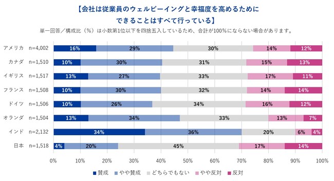 「自分の勤務先は従業員のウェルビーイングと幸福度を高めるためにできることをすべて行なっている」という考えに賛成する人の割合を見ると、インドが著しく高い一方で、日本は顕著に低い結果となりました。賛成・やや賛成の合計割合は多い順に、インド(71%)、オランダ(47%)、アメリカ(45%)、カナダ(41%)、イギリス・フランス(40%)、ドイツ(37%)、日本(24%)です。インドは日本の約3倍の結果となりました。