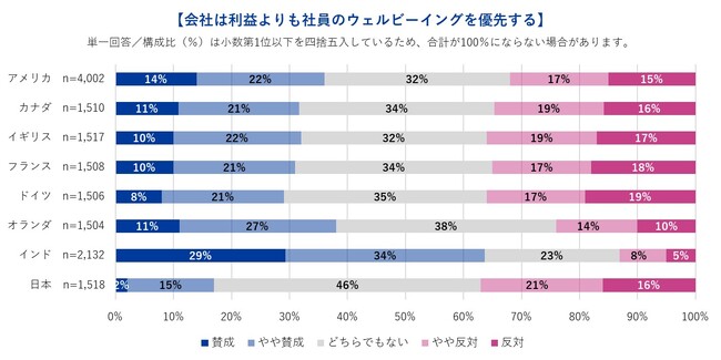 ・会社は利益よりも従業員のウェルビーイングを優先している、と感じる割合、日本は17%で8カ国中最下位。インドの63%とは約3.7倍の開き