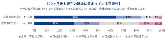 ・『成長意欲が高い』従業員は、83%が12ヵ月後も現在の職場に留まる意向を示したのに対し、『成長意欲が低い』従業員は51%に留まる