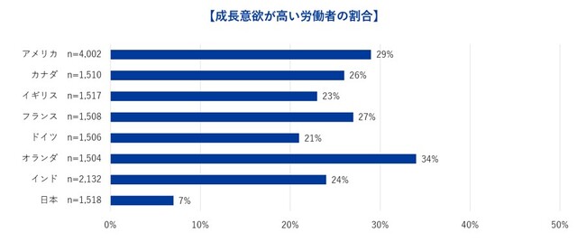 ・『成長意欲が高い』労働者の割合、日本はわずか7%で8ヵ国中最下位