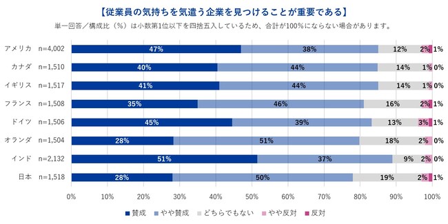 「従業員の気持ちを気遣う企業を見つけることは重要である」という考えに賛成する人の割合を見ると、8ヵ国すべてで高い水準にあることがわかりました。賛成・やや賛成を合わせた割合が多い順に、インド(88%)、アメリカ・イギリス(85%)、カナダ・ドイツ(84%)、フランス(82%)、オランダ(79%)、日本(78%)、です。