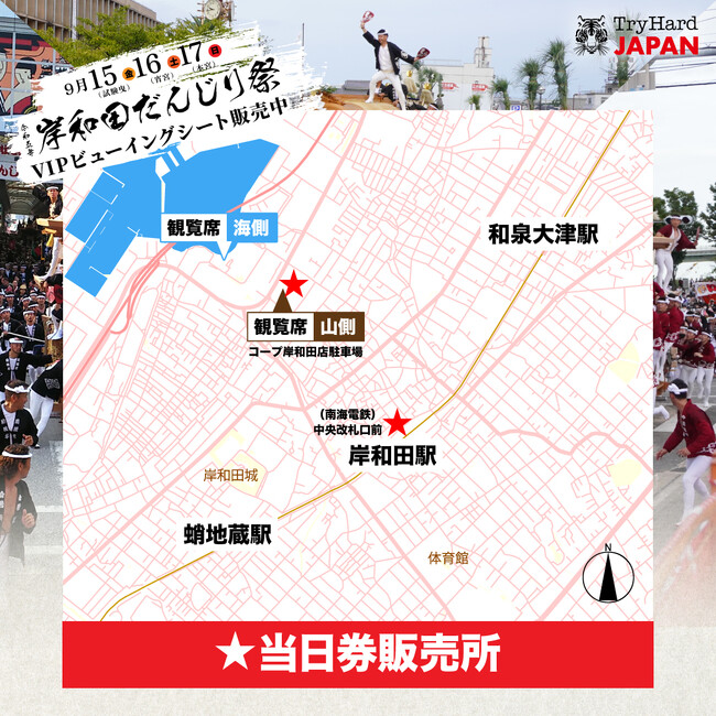 株式会社トライハードジャパン(所在地:大阪市中央区)は、2023年9月15日(金)、16日(土)、17日(日)に大阪府岸和田市で開催される「令和5年度岸和田だんじり祭」有料観覧席(VIPビューイングシート)の当日券を、岸和田駅(南海電鉄)の中央改札口前およびコープ岸和田店(駐車場)の2箇所で販売いたします。