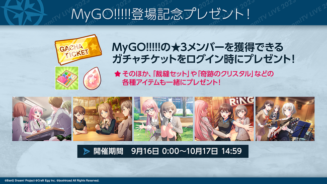 開催期間中にログインすることで、MyGO!!!!!の★3メンバーを獲得できるガチャチケットをプレゼントいたします。