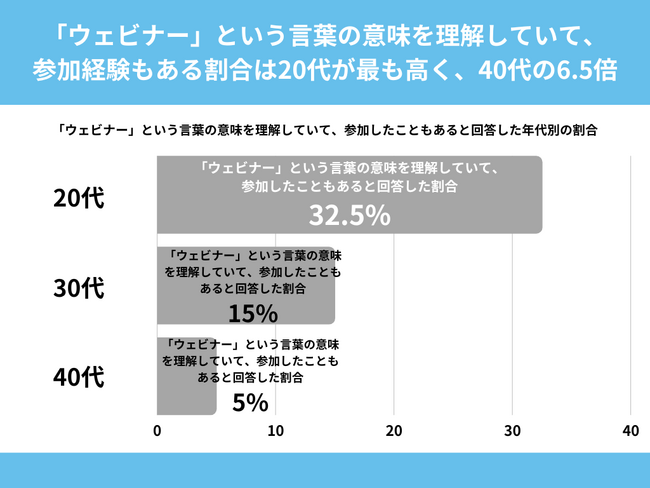 「ウェビナー」という言葉の意味を理解していて、参加したこともあると回答した割合を年代別でみてみますと、20代が最も高く32.5%、次いで30代が15%、40代は5%という結果になりました。