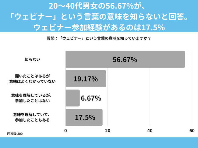 20~40代男女の56.67%が、「ウェビナー」という言葉の意味を知らないと回答。ウェビナー参加経験があるのは17.5%【ウェビナーに関するアンケート】