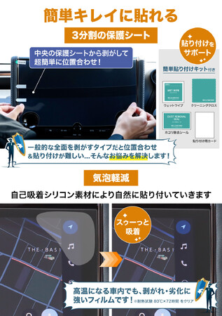 保護シートを「3分割」にすることにより、大きなナビ画面でも位置合わせがしやすく、簡単に貼り付けが可能です。また、フィルムの粘着面には特殊シリコン素材を採用。これによりフィルムは自己吸着し、気泡は入りづらく抜けやすくなります。