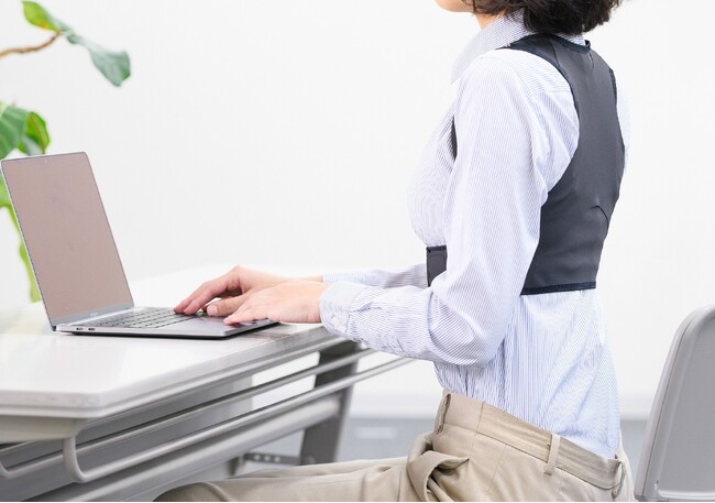 よく伸びて柔らかい生地を使用しているため、腕の動きを妨げにくく、丸まった背すじを心地よく伸ばします。また、生地の厚さは約3mmと薄いため、上に服を着ても目立ちにくく、ラクにシャキッと姿勢を正すことができます。