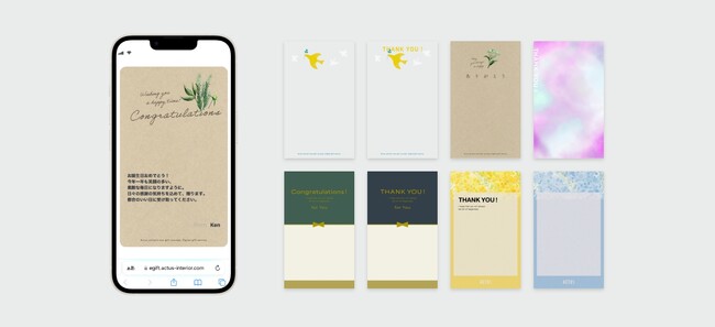 オンラインショップでの購入で「eギフト」を選択すると、一緒に誕生日祝いや日頃の感謝など様々なシチュエーションに合わせたアクタスオリジナルデザインのデジタルメッセージカードを選ぶことができます。メッセージを入力すると、受け取りURLとともにお相手にグリーティングカードとして送ることができます。