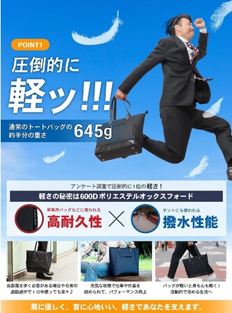 バッグ本体の生地には、軽量ポリエステル素材を採用し、圧倒的な軽さ645gを実現したトートバッグです。この軽量設計により、通勤や日常の持ち運びの負担を軽減し、疲労やストレスを最小限に抑えることで、毎日快適にご使用いただけます。またこの軽量ポリエステルには、高度な撥水コーティングが施されており、雨や水しぶきにも強く、手やタオルなどで軽く拭くだけで簡単に水滴を取り除くことができ、大切な荷物を水濡れから保護します。また、耐久性にも優れるこの生地は、長期間の使用による摩耗や劣化を最小限に抑え、長くご使用いただけます。