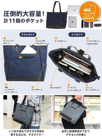 11個の多機能ポケットを備え、A4サイズの資料・書類、財布、14インチのパソコン、タブレット、ペットボトル、水筒、ペン、手帳、小物などを効率的かつスマートに収納でき、大容量で使いやすさを兼ね備えたデザインです。
