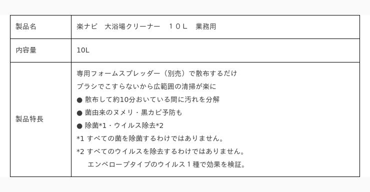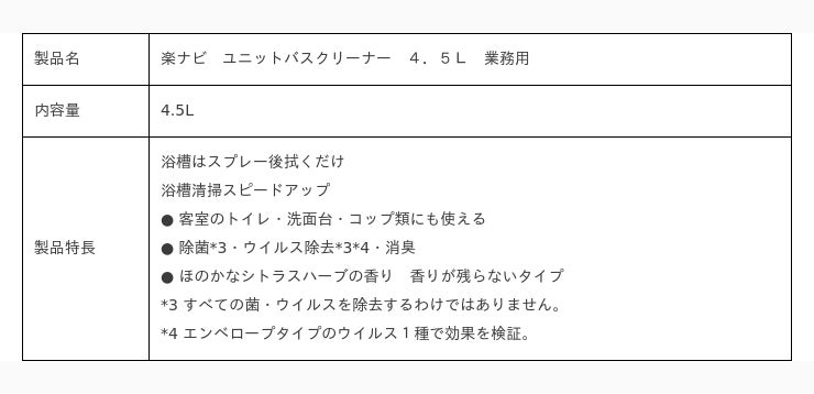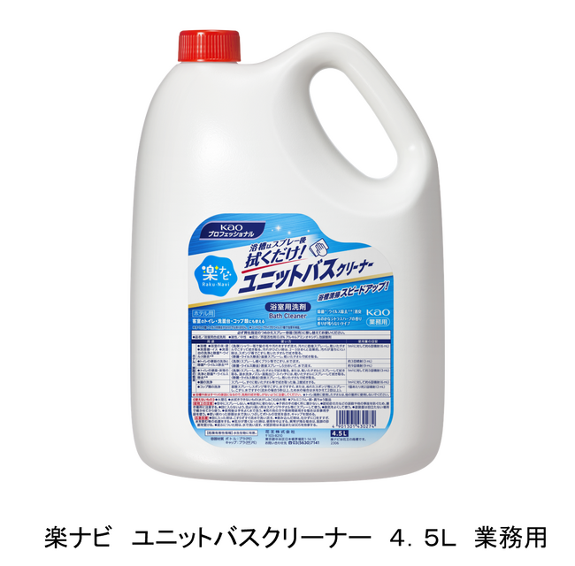 また、ビジネスホテルやシティホテルなどの客室内の浴室清掃には、浴槽にスプレー後タオルで汚れを拭き取るだけの浴室用洗剤「楽ナビ ユニットバスクリーナー」を提案します。ビジネスホテルやシティホテルの浴室清掃特有の仕上げの水滴拭き上げ工程から着想を得た、新たな清掃オペレーションです。浴槽の清掃は、スポンジによるこすり洗いや洗剤のすすぎが不要となり、清掃負担軽減と時間短縮、水使用量の削減が期待できます。トイレや洗面台、コップ類にも使えるので洗剤の使い分けが不要となり、1本でユニットバスの清掃に対応できます。