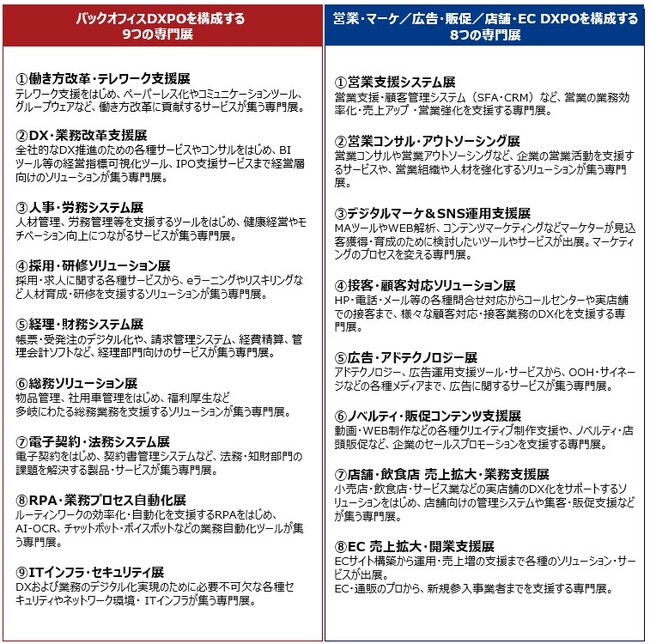 後半2日間[2023年10月12日(木)・13日(金)]開催の、『第1回 営業・マーケ/広告・販促/店舗・EC DXPO福岡’23』は、製品ジャンル毎に、8つの展示会で構成され、MAツール、CRM、SFA、アドテクから、営業代行、コンテンツ制作、店舗のDX化、ECサイト構築まで、営業・マーケ・販促部門および、店舗・ECの売上アップ・業務効率化を支援する注目のIT製品が一堂に出揃う。