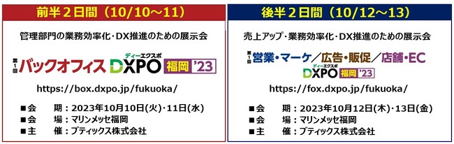 展示会事業、M&A仲介事業などを展開する、ブティックス株式会社(東京都港区、代表取締役社長 新村祐三、東証グロース上場 証券コード:9272)は、企業の業務効率化・売上アップ・DX推進をテーマとした以下の2つの展示会を、マリンメッセ福岡にて連続開催する。