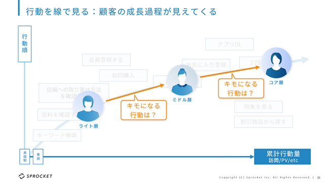 ロイヤル顧客の育成は多くの企業が注目していますが、オンラインはブラックボックス化していて手がかりが少ないことが課題です。Sprocketでは、ユーザーの行動データをもとに「どのような行動がサイトの再訪やリピート購入を生んでいるのか?」という視点で分析し、具体的な施策の手がかりを見いだします。
